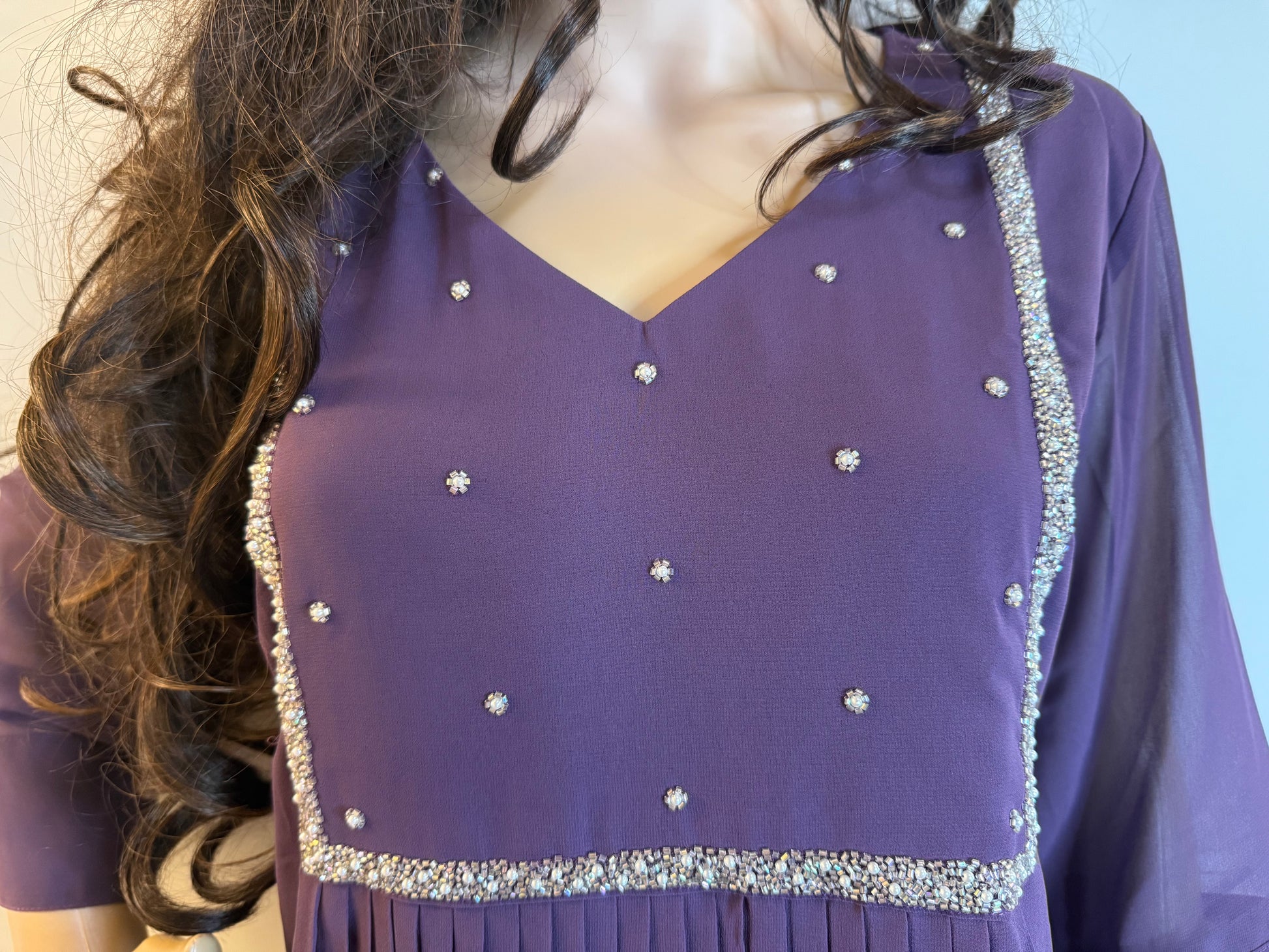 Elevate your everyday wardrobe with this exquisite purple kurti crafted from pure georgette fabric, renowned for its lightweight drape and breathable comfort. The standout feature is the meticulously executed handwork adorning the entire yoke, showcasing traditional artisanal craftsmanship that adds sophistication and visual interest to the neckline and shoulders.